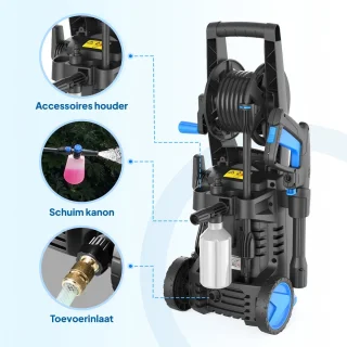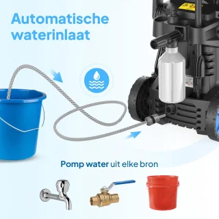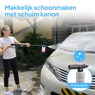 - Externe foam cannon: brengt dik schuim aan zonder dat reinigingsmiddel door de pomp loopt, wat de levensduur van de pomp verlengt en veilig gebruik van sterke middelen mogelijk maakt.