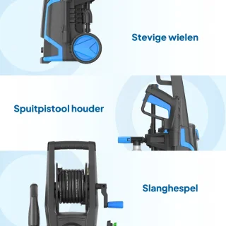 De Pressure Pro is ontworpen met oog voor praktisch gebruik: de geïntegreerde slanghaspel houdt de 5 meter lange slang netjes opgeborgen, terwijl het 5 meter lange snoer zorgt voor voldoende bereik zonder verlengsnoer. Het handvat en de wielen maken verplaatsen eenvoudig. De aluminium pomp en kwaliteit van de motorcomponenten (koperwikkelingen) leveren betrouwbaarheid en een langere levensduur. Het start/stop-systeem zorgt voor zuinig werken en minder slijtage doordat de motor alleen draait wanneer u het spuitpistool indrukt.